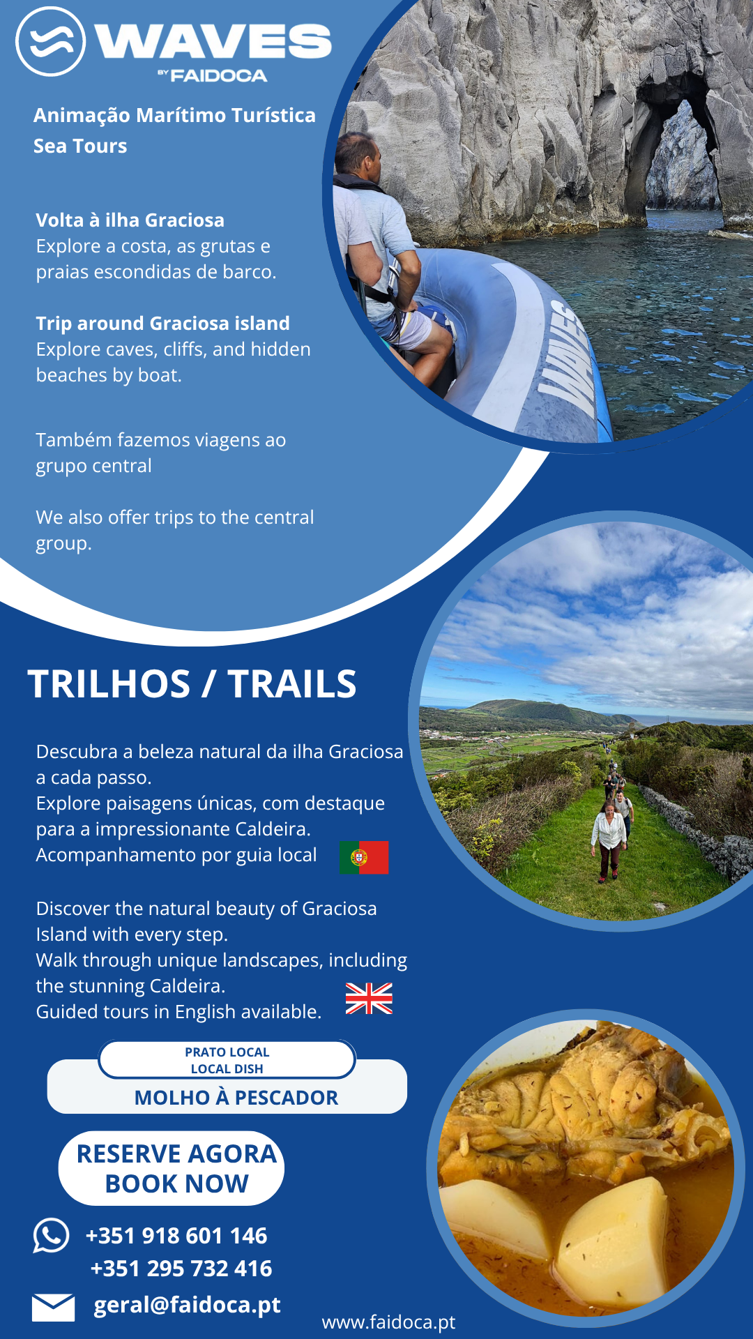 A Waves é uma empresa de turismo marítimo que oferece experiências inesquecíveis nas águas dos Açores. Especializados em voltas de barco à ilha Graciosa e viagens para as ilhas do Grupo Central, proporcionamos aventuras únicas e paisagens deslumbrantes.
